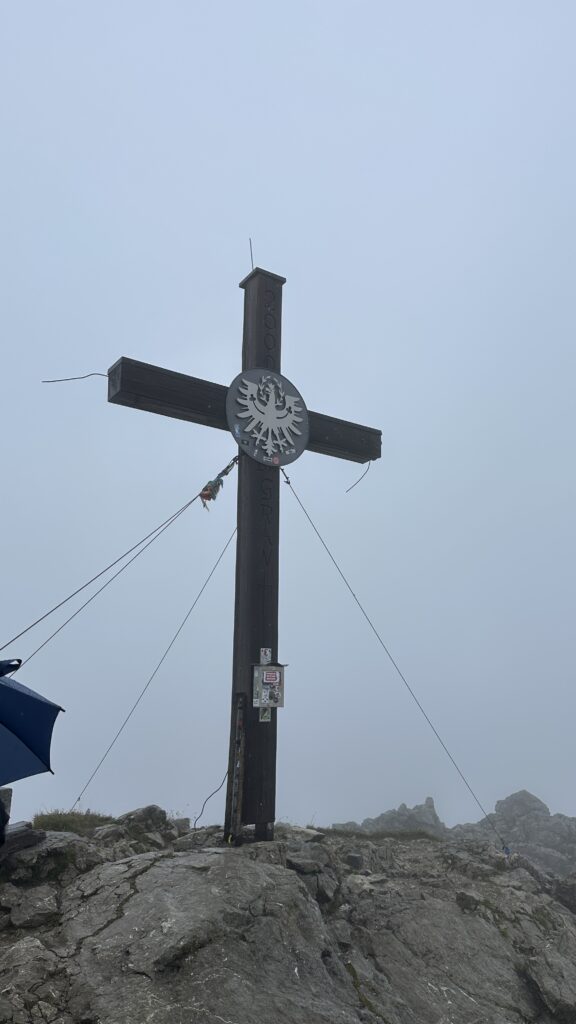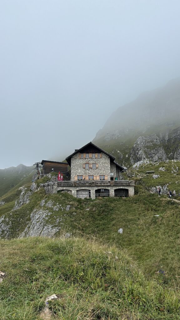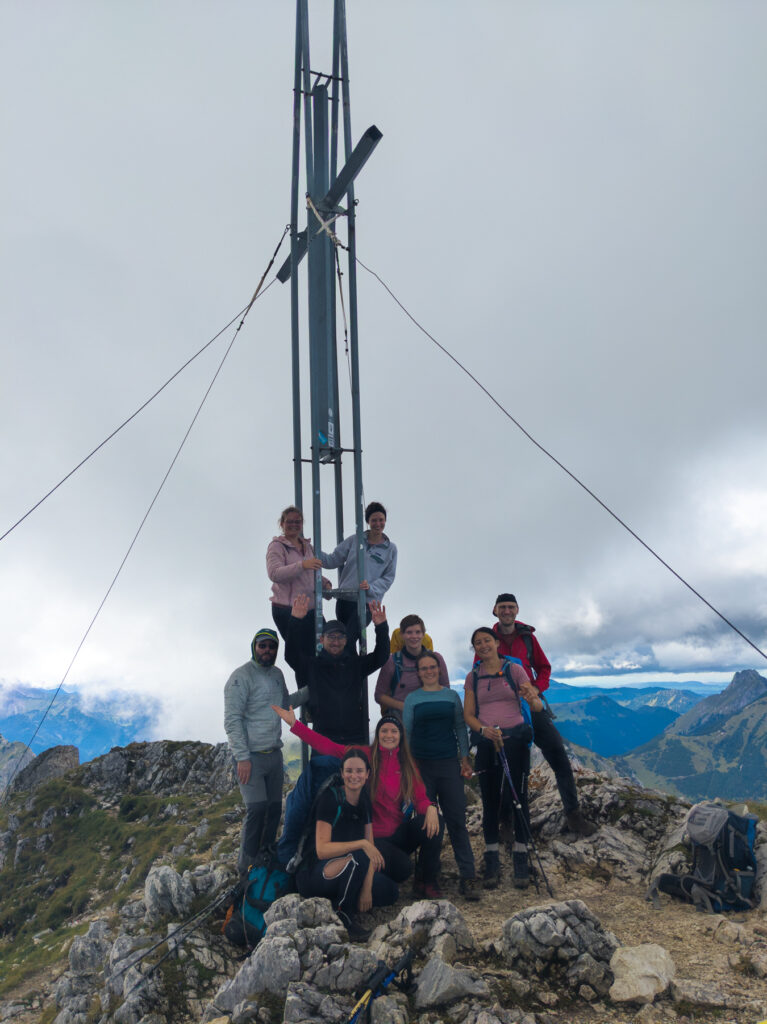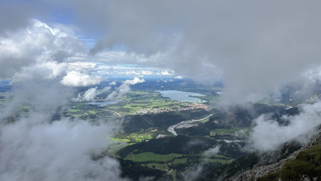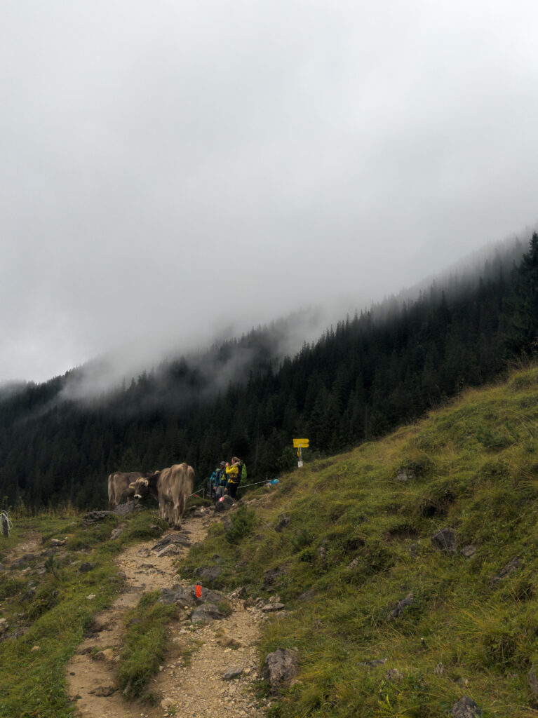 Der nächste Morgen begann nach dem Frühstück für einen Teil der Gruppe auf den in den Wolken hängenden Aggenstein (1985 m) in der Nähe der Hütte. Anschließend machte sich die ganze Gruppe auf den Weg Richtung Otto-Mayr-Hütte. Der Weg führte uns über mystisch nebelverhangene Almen mit Kühen. Mittags kehrten wir für eine Rast auf dem Füssener Jöchle ein, bevor wir weiter auf die große Schlicke (2059 m) gingen. Der Himmel hatte sich bis dahin etwas aufgezogen, sodass wir von dort eine gute Aussicht hatten. Von der großen Schlicke stiegen wir dann ab zur sehr malerisch in einem Tal gelegenen Otto-Mayr-Hütte