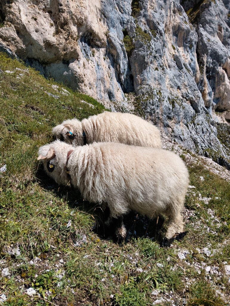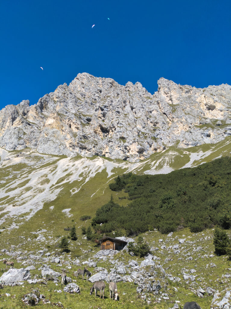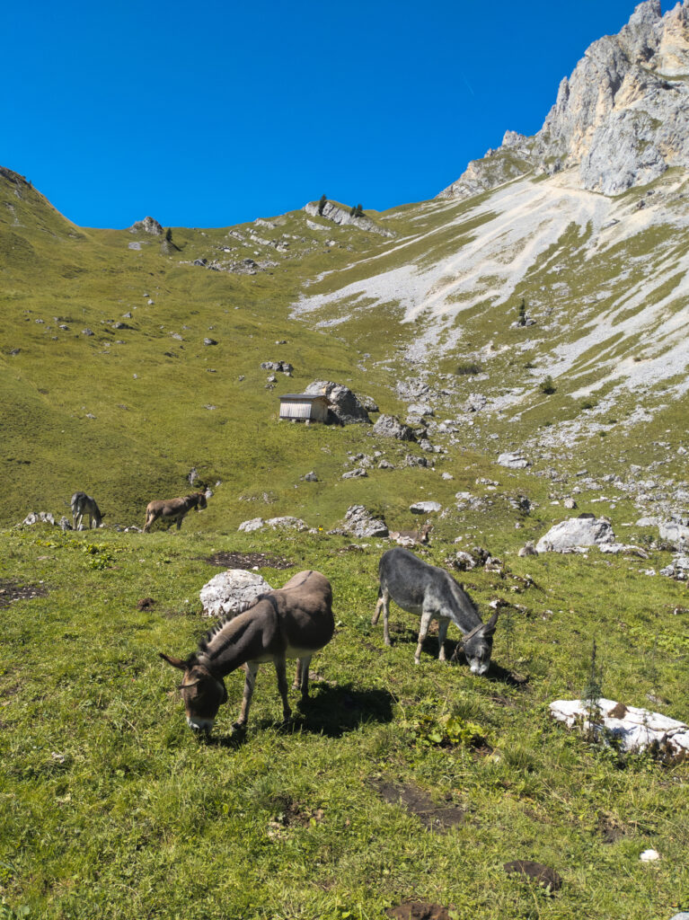 Der darauffolgende Sonntag war mit stabilen und sonnigen Wetterbedingungen gesegnet und wir begannen mit dem Aufstieg auf die Nesselwängler Scharte. Hier teilte sich die Gruppe auf. Eine Hälfte der Gruppe bestieg noch die Kellenspitze (2238 m) und der andere Teil der Gruppe wanderte gemütlich voraus über Bergpfade, Geröllfelder und vorbei an Schafen und einer ganzen Herde an sehr zutraulichen Eseln bis zu der leider an diesem sonnigen Sonntag sehr gut gefüllten Schneetal Alm.