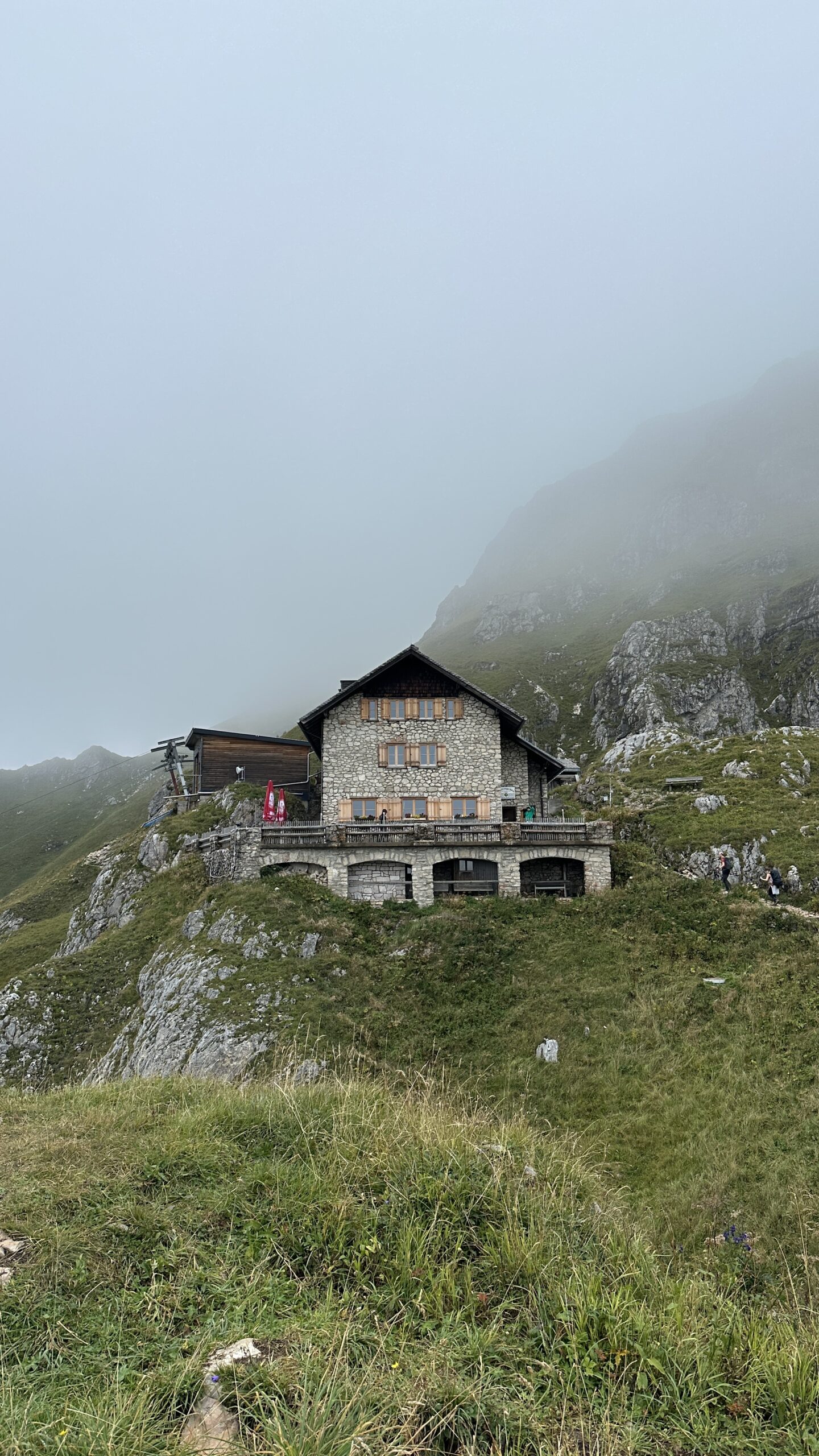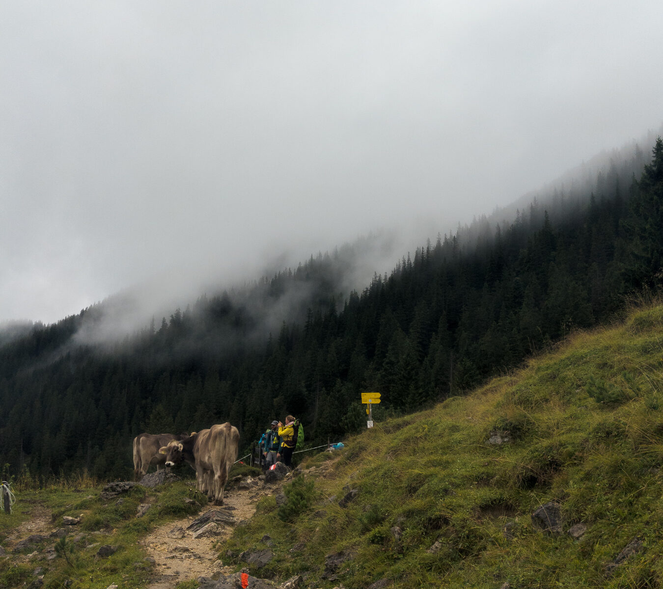Der nächste Morgen begann nach dem Frühstück für einen Teil der Gruppe auf den in den Wolken hängenden Aggenstein (1985 m) in der Nähe der Hütte. Anschließend machte sich die ganze Gruppe auf den Weg Richtung Otto-Mayr-Hütte. Der Weg führte uns über mystisch nebelverhangene Almen mit Kühen. Mittags kehrten wir für eine Rast auf dem Füssener Jöchle ein, bevor wir weiter auf die große Schlicke (2059 m) gingen. Der Himmel hatte sich bis dahin etwas aufgezogen, sodass wir von dort eine gute Aussicht hatten. Von der großen Schlicke stiegen wir dann ab zur sehr malerisch in einem Tal gelegenen Otto-Mayr-Hütte