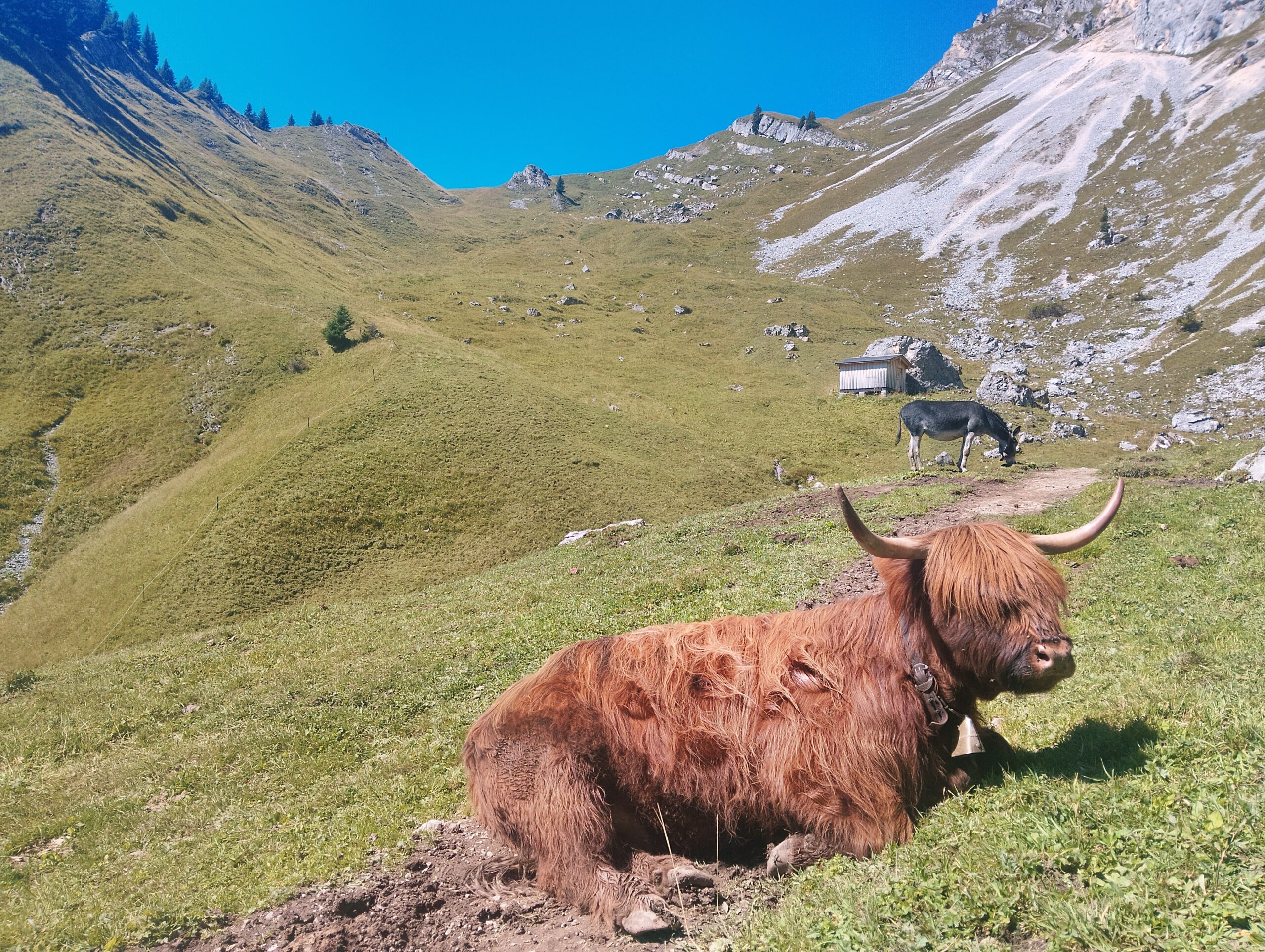 Nach der Rast dort schlossen sich noch wenige Kilometer Bergpfade bis zur Höfener Alm an. Hier hatten wir unsere Unterkunft direkt über dem Kuhstall. Am nächsten Morgen wurden wir von den Glocken der Kühe direkt unter uns geweckt und es folgte der Abstieg ins Tal zum Bahnhof in Reutte.
