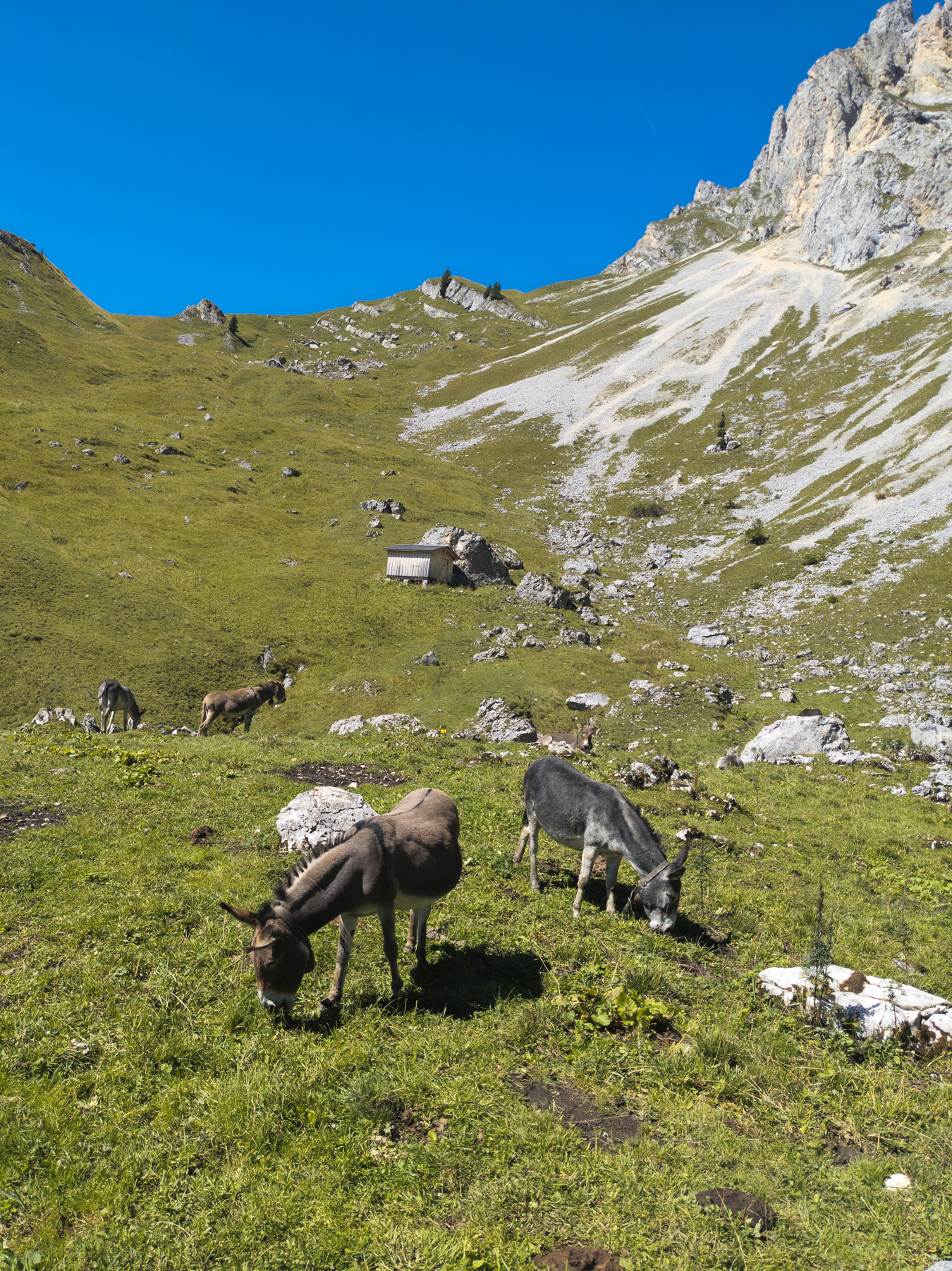 Der darauffolgende Sonntag war mit stabilen und sonnigen Wetterbedingungen gesegnet und wir begannen mit dem Aufstieg auf die Nesselwängler Scharte. Hier teilte sich die Gruppe auf. Eine Hälfte der Gruppe bestieg noch die Kellenspitze (2238 m) und der andere Teil der Gruppe wanderte gemütlich voraus über Bergpfade, Geröllfelder und vorbei an Schafen und einer ganzen Herde an sehr zutraulichen Eseln bis zu der leider an diesem sonnigen Sonntag sehr gut gefüllten Schneetal Alm.